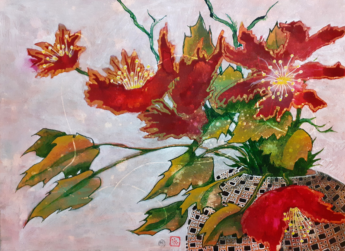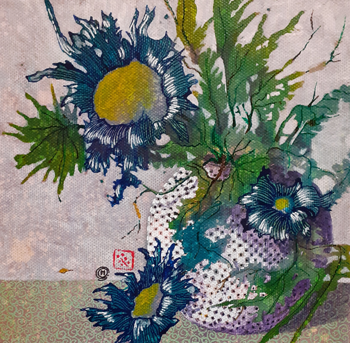 Het leven begint niet op een blanco doek. Het is gevuld met de chaos van het verleden en het heden. Daarom start ze met een chaos van kleuren en vlekken. Dit wordt verder getransformeerd tot fantasierijke bloemstillevens en harmonieuze composities. De techniek houdt in dat ze eerst het doek vult met vegen en vlekken verf, vervolgens gaat ze zoeken in de chaos en bedekt het schilderij gedeeltelijk met witte verf. Ten slotte geeft ze het kunstwerk vorm met lijnen en patronen in acrylverf en acryl inkt.