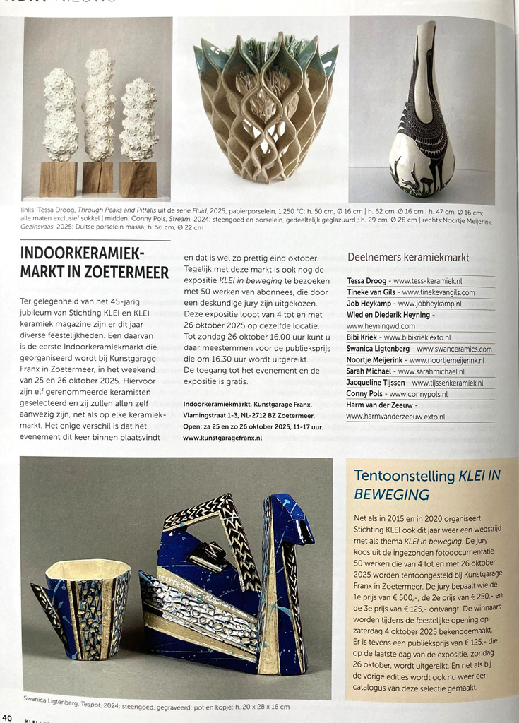 In het weekend van 25 en 26 oktober 2025 exposeert Tessa tijdens de indoor keramiekmarkt bij Galerie Franx in Zoetermeer.
